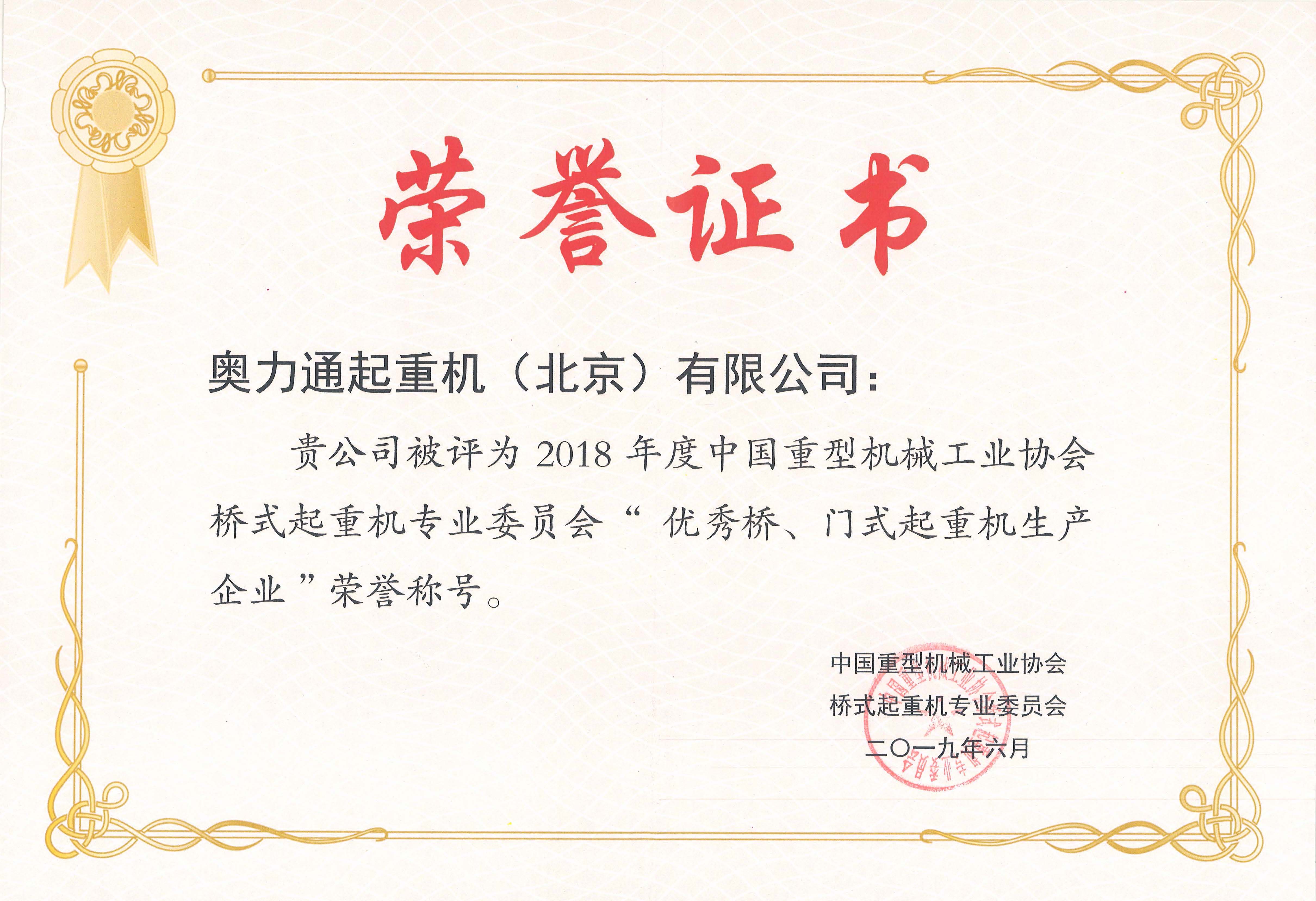 (奧力通榮獲2018年度“優(yōu)秀橋、門式起重機生產(chǎn)企業(yè)”)