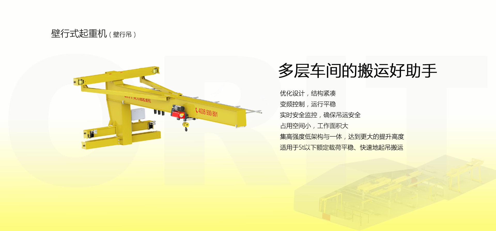 產品名稱:壁行式起重機 多層車間的最佳選擇 優化設計,結構緊湊 變頻控制,運行平穩 實時安全監控,確保吊運安全 占用空間小,工作面積大 集高強度低架構與一體,達到最大的提升設計 適用于5t以下額定載荷平穩、快速地起吊搬運。 標準配置1:起升機構 顛覆傳統,自成一體 低凈空設計 柔性驅動,內應力小,傳動效率高 重級制電機,接電持續率60%ED 行走變頻無極調速,運行平穩 自調試電磁盤式制動器,可靠,防塵 2160N/mm2 高強度鍍鋅鋼絲繩,免維護 全周型導繩器,防松繩 全系標配安全監控系統 標準配置2:三合一驅動 靜音科技,靜享搬運 結構緊湊,鋁合金殼體,密封 變頻電機+硬齒面減速箱+盤式制動器 龍門專用C型三合一集成化設計,節約空間 全變頻調速 最高轉速4800 r/min 防護等級IP55 半油脂潤滑,免維護 靜音科技,靜享搬運 標準配置3:電控系統 安全隨心掌控 智能安全監控器 計算起升機構剩余安全工作時間 累計起升工作時間 累計超載次數 累計起升電機啟動次數 起升電機過熱保護及報警 剎車片厚度報警 ... ... 遠程通訊 施耐德電氣元件 航空插座接口 IP55防護等級 標準配置4:端梁 多變靈活,適應自如 模塊化直驅設計 自重輕、體積小 QT700車輪,自潤滑,更靜音 采用調心軸承,適應更自如 雙輪緣端梁與平輪端梁完美結合, 既滿足受力要求, 又徹底的解決了三條端梁(軌道)可能產生的啃軌問題。 應用